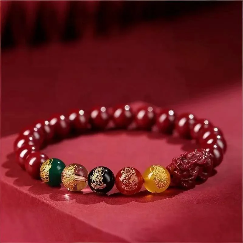 Crafted with vibrant cinnabar beads and symbolic elements representing the Five Wealth Gods, this bracelet blends cultural heritage with modern style, making it a meaningful accessory for both men and women.